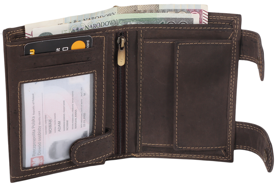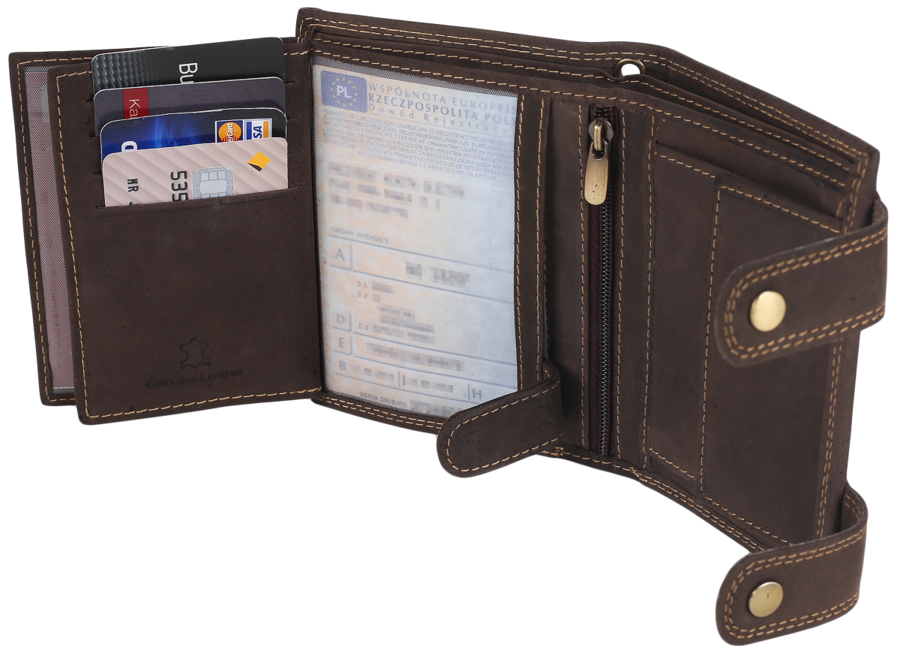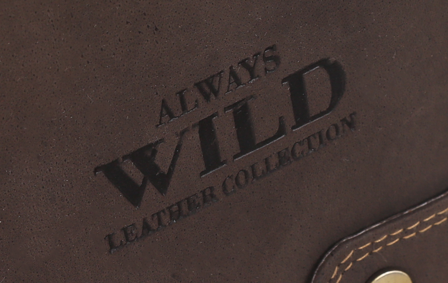 Portfel Polskiej marki Always Wild wykonany jest ze skóry naturalnej nubukowej w kolorze brązowym. Posiada dwie zewnętrzne zapinki oraz długi solidny łańcuch.