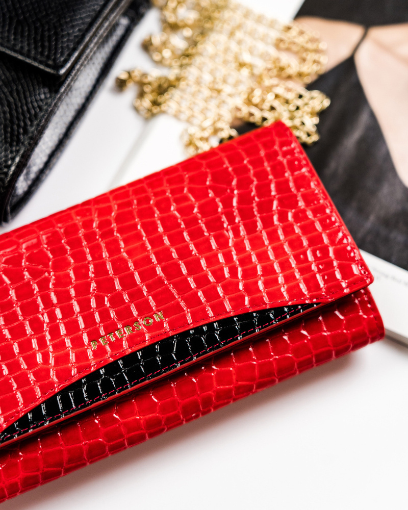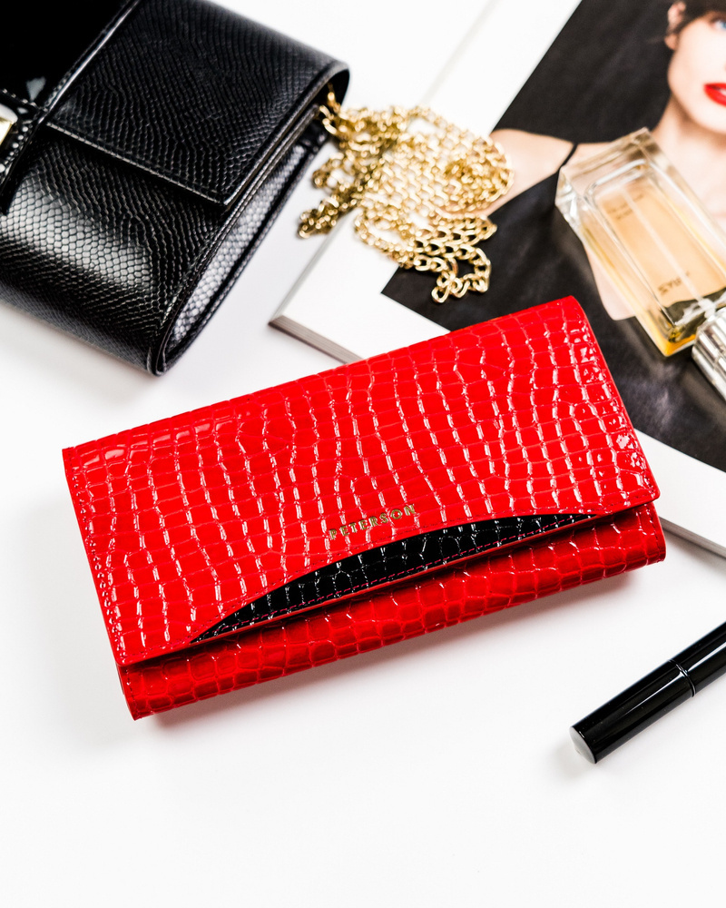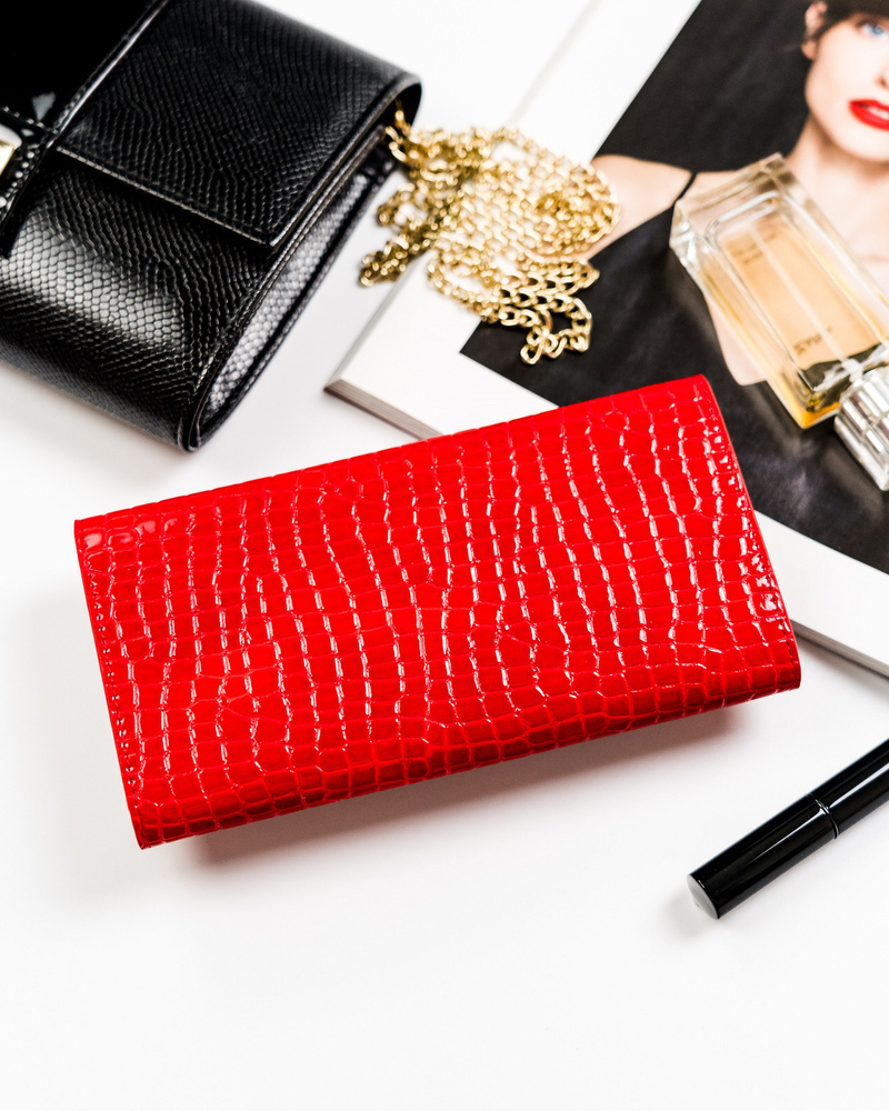 - Portfel z krokodylim wzorem | Portfel o klasycznym fasonie w zmysłowym, czerwonym kolorze, z ozdobną czarną wstawką na klapce. Na zewnątrz ozdobiono go tłoczonym wzorem imitującym skórę krokodyla. Eleganckim dopełnieniem są złote okucia, które świetnie współgrają z tym kolorem