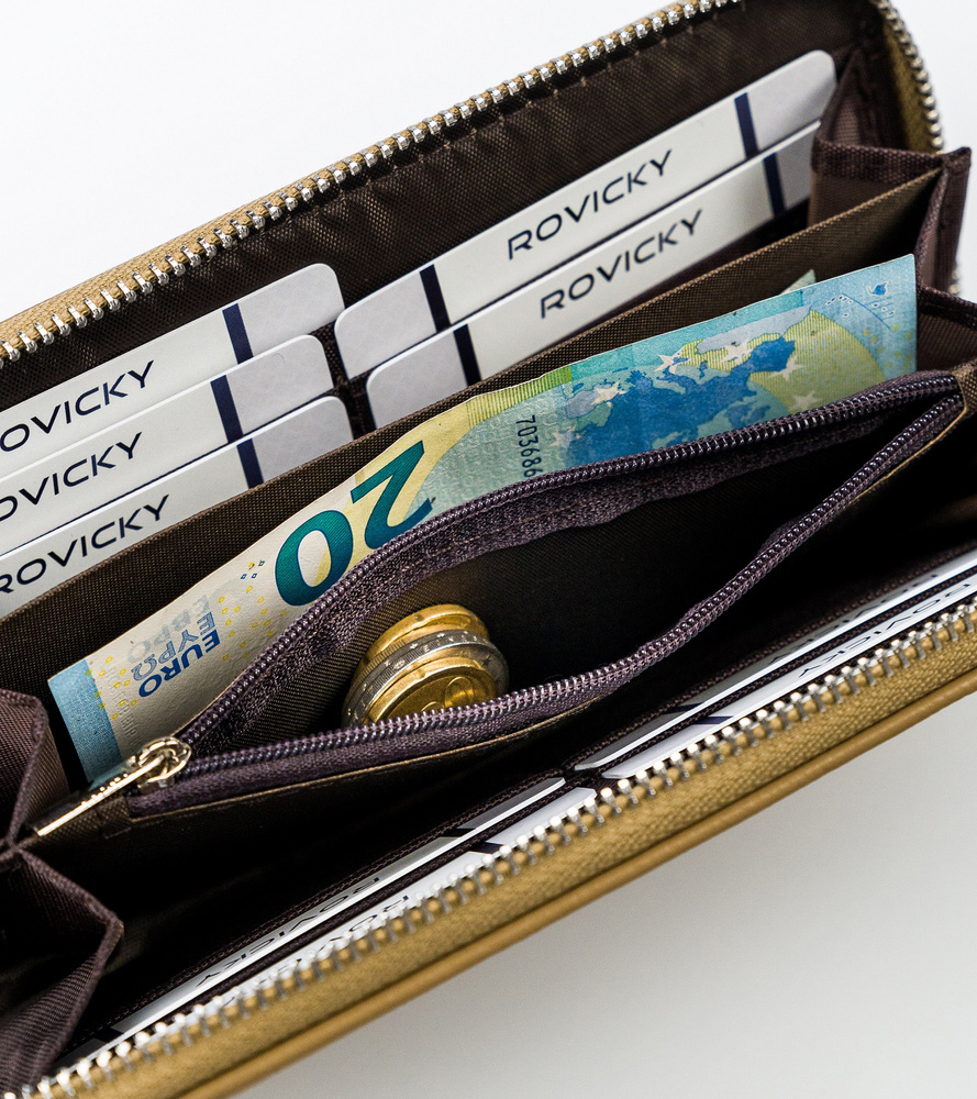 - na banknoty wydzielone są 3 duże, otwarte kieszenie. Taka ilość kieszonek umożliwia wygodną segregację banknotów według ich nominału bądź też segregowania pieniędzy, jeżeli korzystać z więcej niż jednej waluty.